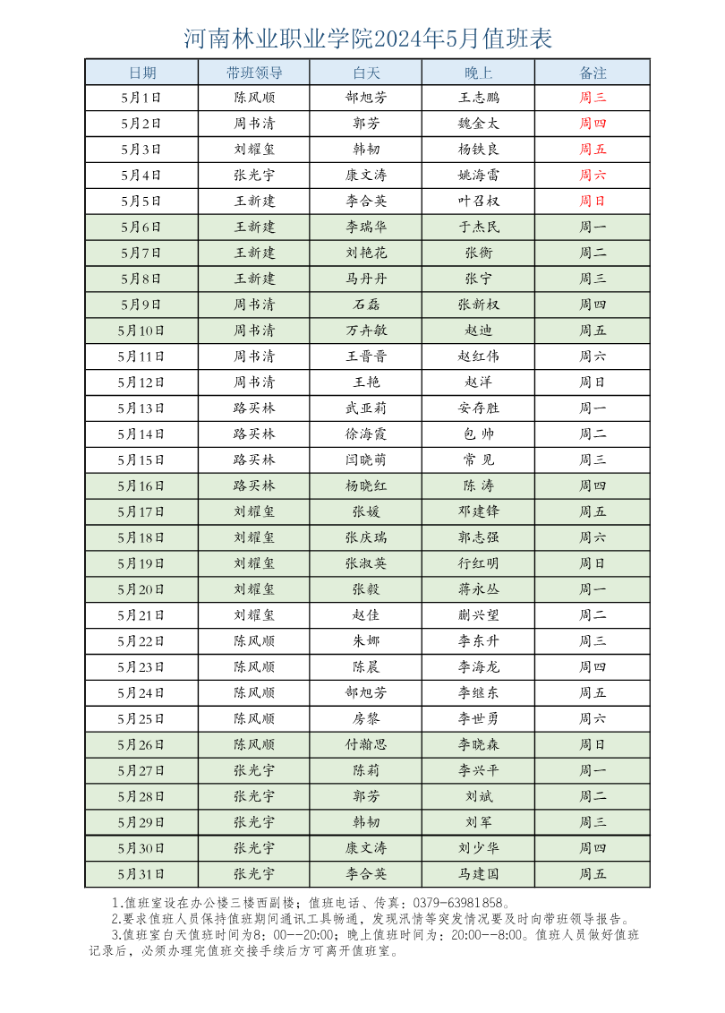 河南林业职业学院2024年5月值班表