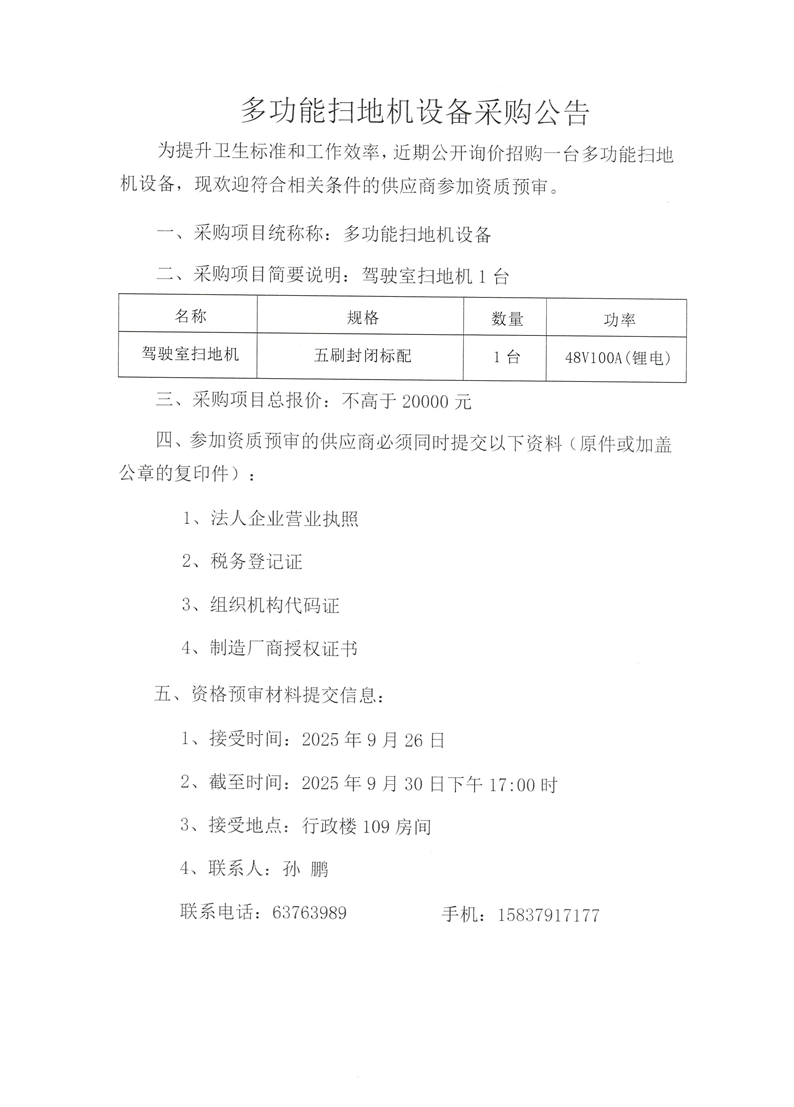 多功能扫地机设备采购公告
