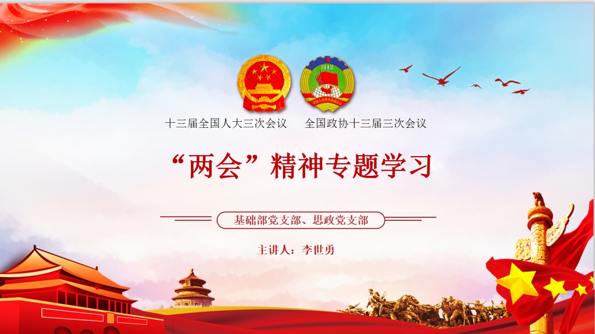 基础部党支部书记李世勇同志带领大家学习全国“两会”精神,他重点讲解了两会的几大看点及热点调查,并要求大家结合自身岗位职责,重点学习业务相关新精神,并在实际工作中切实贯彻落实。思政党支部书记武亚丽同志带领大家学习了《民法典》,号召大家尊崇法律,模范遵守法律。