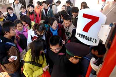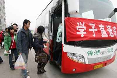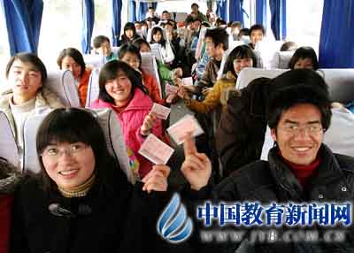 1月26日,湖北经济学院回家过年的学生坐上了学校送站专车。该校在学生返乡时派出10辆专车,把回家过春节的大学生分别送到火车站、长途汽车站等站点,使他们安全换乘车辆返家。杨宏斌摄 铁道部新闻发言人王勇平介绍,在2007年春运期间,全国将在10个高校集中的城市进行返程票试点工作,其中包含北京、天津、长春、上海、南京、武汉、广州、重庆、成都和西安。这些普通高校和研究院所的学生,可在学校购买回家车票的同时,购买春节过后从家返回学校的车票。办理学生返程票不向学生收取任何附加费用。 对于这个新生事物,中国人民大学后勤集团党委书记兼副总经理裴晟在接受记者采访时说,返程票措施是一个大进步,是一件大好事。许多离大站有点距离,且在大城市没有亲戚的学生,可以通过这次订票买到满意的返程票,而不需要在年后专程跑到城里去购票,省时省力。 为不影响学生的期末考试,许多地方开始推出“送票进校园”活动,让学生安心学习。据悉,杭州火车站从1月5日起的12天左右时间,上门到11所大学13个场所流动发售学生票,提前预售18天内的学生票。1月6日,22名长沙火车站工作人员使用8台售票机在湖南涉外经济学院开始售票,很多师生对此感到非常惬意和方便。长沙铁路局今年就挑选出10所高校,从1月6日到1月16日,在不同的高校为学生提供送票上门服务。学生只需凭自己的学生证就可在校内购买到自己需要的学生票,免去了在火车站与学校之间的来回奔波及长时间排队还买不到票之苦,安心学习备考。成都铁路局也采取了同样的措施,组织了10个人的小分队走进成都信息工程学院、成都大学售票,让很多大学生足不出校就买到了乘心如意的车票。 在春运期间,各高校也纷纷采取了一系列人性化措施,为大学生切实解决各类实际问题。北京理工大学已经连续几年为家庭困难的学生提供往返路费。今年,该校有5名藏族学生获得学校资助的1020元火车半价硬卧路费,搭乘新近开通的青藏铁路回到雪域高原与家人团聚。北京师范大学也加强和中国扶贫基金会“新长城计划”合作,给20多名贫困生每人争取到400元的爱心路费。中国农业大学通过各种方式筹措到17万元资金,为475名学生解决了春节路费难题,使这些难得回一趟家乡的贫困学生能够拿到一张回家的车票。 针对春运期间学生流相对集中的情况,各地公路客运也进入忙碌状态。浙江省建设厅指出,各地要特别关注外地学生的平安返乡和顺利返城问题,开设学校和企业专线。据了解,杭州市公交总公司已从1月26日起开通7条“民工、学生临时专线”,大大缓解了客流拥堵的现象。 为让外地学生能顺利返回家乡,1月12日起,四川省泸州市各大专院校为落实泸州市委、市政府“惠民行动”工程,与运管部门及有关单位通力合作,调用60辆空调大巴,开展“专车送大学生平安返乡过年”行动。 |
