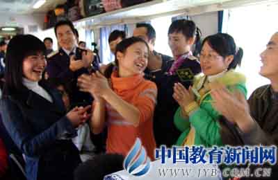 ▲1月14日,在T366次列车上,昆明客运段广昆一组的列车员与昆明理工大学回南宁的学生举行联欢活动。汪建云 摄