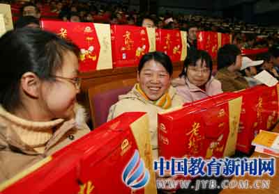 1月26日,北京理工大学500名家庭经济困难学生济济一堂,参加了学校组织的2007年春节“向学生送温暖”活动。学校不但向这些学生提供了回家过年的往返路费,还替这些学生给家长准备了一份礼物,让他们“把学校的祝福带回家”。本报记者 修伯明 摄