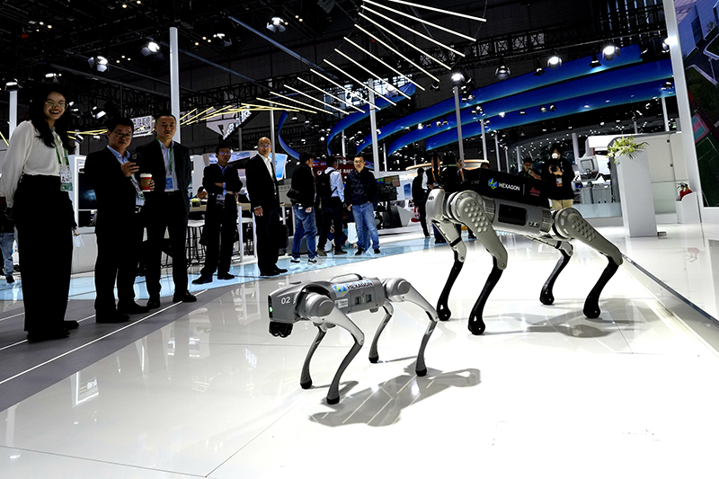 2023年11月7日,在第六届进博会技术装备展区,观众观看智能机器狗。新华社记者 张建松 摄