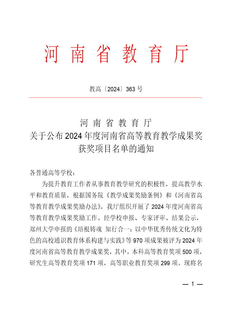 我校获2024年度河南省高等教育教学成果奖特等奖