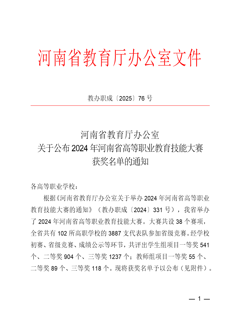 关于公布2024年河南省高等职业教育技能大赛获奖名单的通知