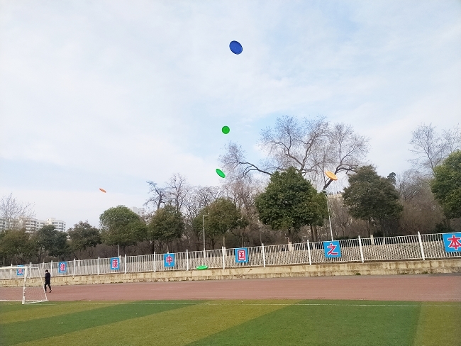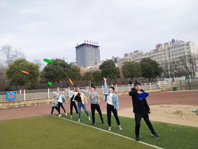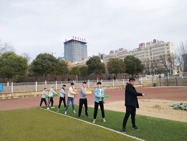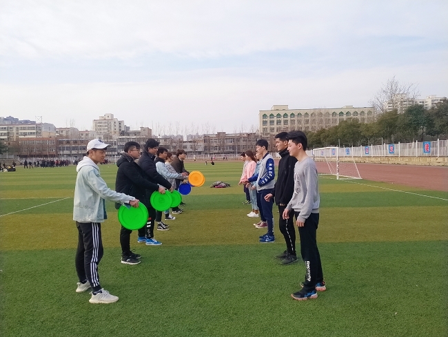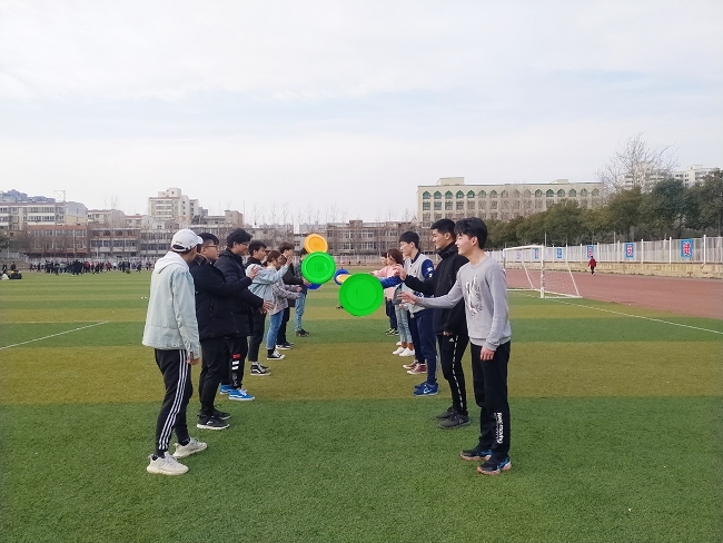 先开始热身,同学们对立两面,一面的同学同时掷出飞盘,对面同学默契的接住飞盘再掷回对面